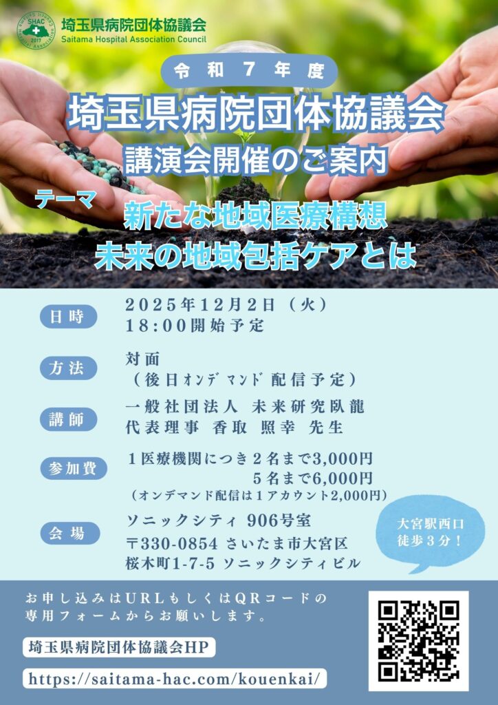 講 演 会 2025年度 【埼玉県病院団体協議会】 令和7年度埼玉県病院団体協議会講演会を開催いたします テーマ:新たな地域医療構想 未来の地域包括ケアとは 講 師:一般社団法人 未来研究所臥龍 代表理事 香取 照幸 先生 日 時:2025年12月2日(火)18:00~19:55 会 場:ソニックシティ 906号室 後 援:一般社団法人埼玉県医師会 共 催:日本医療法人協会埼玉県支部、全日本病院協会埼玉県支部、 日本病院会埼玉県支部、埼玉県慢性期医療協会 詳 細:以下のファイルをご確認ください 講演会のご案内 ご案内チラシ 講師のご紹介 申 込:以下のリンクからお申し込みください 【2025年12月2日】令和7年度埼玉県病院団体協議会講演会 お申し込みフォーム 参加費:1医療機関につき2名まで3,000円、5名まで6,000円 オンデマンド配信は1アカウント2,000円 2024年度 【埼玉県病院団体協議会】令和6年度第2回埼玉県病院団体協議会講演会を開催しましたテーマ:社会保障をとりまく環境の趨勢とこれからの医療政策講 師:慶応義塾大学 商学部教授 権丈 善一 先生日 時:2025年 2月 5日(水)18:00~20:05会 場:さいたま共済会館後 援:一般社団法人埼玉県医師会(予定)共 催:日本医療法人協会埼玉県支部、全日本病院協会埼玉県支部、 日本病院会埼玉県支部、埼玉県慢性期医療協会参加費:1病院につき3,000円 【埼玉県病院団体協議会】 令和6年度第1回埼玉県病院団体協議会講演会を開催しました テーマ:災害でも医療を止めないために 講 師:社会医療法人財団董仙会 恵寿総合病院 理事長 神野 正博 先生 ※冒頭に埼玉県各課員並びに埼玉県警察課員よりお話をいただきます 日 時:2024年 7月10日(水)18:00~20:05 会 場:ソニックシティ 後 援:一般社団法人埼玉県医師会(予定) 共 催:日本医療法人協会埼玉県支部、全日本病院協会埼玉県支部、 日本病院会埼玉県支部、埼玉県慢性期医療協会 参加費:1病院につき3,000円 2023年度 【埼玉県病院団体協議会】令和5年度第2回埼玉県病院団体協議会講演会を開催しましたテーマ:診療報酬改定について講 師:日本慢性期医療協会 副会長 池端 幸彦 先生『2024年度診療報酬改定の概要からみた病院経営の近未来』※冒頭に埼玉県各課員並びに埼玉県警察課員よりお話いただきました日 時:2024年 2月 16日(金)19:00~21:00会 場:ソニックシティ後 援:一般社団法人埼玉県医師会共 催:日本医療法人協会埼玉県支部、全日本病院協会埼玉県支部、 日本病院会埼玉県支部、埼玉県慢性期医療協会参加費:1病院につき3,000円 【埼玉県病院団体協議会】令和5年度第1回埼玉県病院団体協議会講演会を開催しましたテーマ:次期診療報酬・介護報酬改定、第8次医療計画について講 師:公益社団法人全日本病院協会 会長 公益社団法人日本医師会 副会長 猪口 雄二 先生※冒頭に埼玉県保健医療部の各課長よりお話をいただきました日 時:2023年 7月 12日(水)19:00~21:00会 場:ソニックシティ後 援:一般社団法人埼玉県医師会共 催:日本医療法人協会埼玉県支部、全日本病院協会埼玉県支部、 日本病院会埼玉県支部、埼玉県慢性期医療協会参加費:1病院につき3,000円 2022年度 【埼玉県病院団体協議会】 令和4年度第2回埼玉県病院団体協議会講演会を開催しました テーマ:待ったなし!医師の働き方改革への取組み 講 師:特定社会保険労務士、厚労省「医師の働き方改革に関する検討会」構成員 塩原公認会計士事務 福島 通子 先生 埼玉労働局 労働基準部 監督課 主任地方労働基準監察監督官 生木谷 忠司 様 埼玉県 保健医療部 医療人材課 課長 加藤 孝之 様 埼玉医科大学総合医療センター 高度救命救急センター長 澤野 誠 様 日 時:2023年 2月 8日(水)19:00~21:00 会 場:さいたま共済会館 後 援:一般社団法人埼玉県医師会 共 催:日本医療法人協会埼玉県支部、日本病院会埼玉県支部、 全日本病院協会埼玉県支部、埼玉県慢性期医療協会、 全国自治体病院協議会埼玉県支部 参加費:1病院につき3,000円 【埼玉県病院団体協議会】 令和4年度第1回埼玉県病院団体協議会講演会を開催しました 講演内容:令和4年度診療報酬改定を踏まえた動向について 講 師:日本医師会 会長 松本吉郎 先生 日 時:10月3日(月)19:00~20:00 WEB開催 共 催:日本医療法人協会埼玉県支部、日本病院会埼玉県支部、 全日本病院協会埼玉県支部、埼玉県慢性期医療協会、 全国自治体病院協議会埼玉県支部 【日本医療法人協会埼玉県支部】 2022年度Web講演会を開催しました タイトル:我が国の医療IT化の方向性 講 師:厚生労働省保険局 医療介護連携政策課長 水谷忠由 先生 期 間:7月4日(月)~7月31日(日) 共 催:埼玉県病院団体協議会